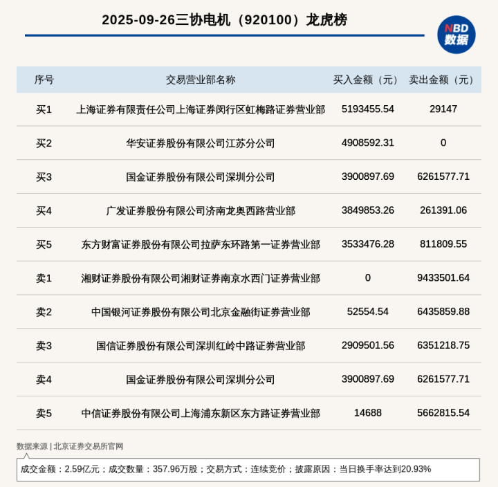 每经讯,2025年9月26日,北交所上市公司三协电机(920100,收盘价:70.91元)登上龙虎榜,交易方式是连续竞价,披露原因是当日换手率达到20.93%,成交数量357.96万股,成交金额2.59亿元。买一席位为上海证券有限责任公司上海证券闵行区虹梅路证券营业部,买入519.35万元;卖一席位为湘财证券股份有限公司湘财证券南京水西门证券营业部,卖出943.35万元。
